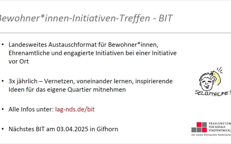 Beim landesweiten Netzwerkformat Bewohner*innen-Initiativen-Treffen kommen Bewohner*innen, Ehrenamtliche und Initiativen dreimal im Jahr bei einer Initiative vor Ort zusammen – am besten bei einem gemeinsamen Mittagessen. In entspannter Atmosphäre könnt ihr euch im Quartier kennenlernen, Erfolge teilen und aus den Erfahrungen anderer lernen. Der direkte Austausch, gegenseitige Inspiration und die Stärkung des Engagements stehen dabei im Mittelpunkt.