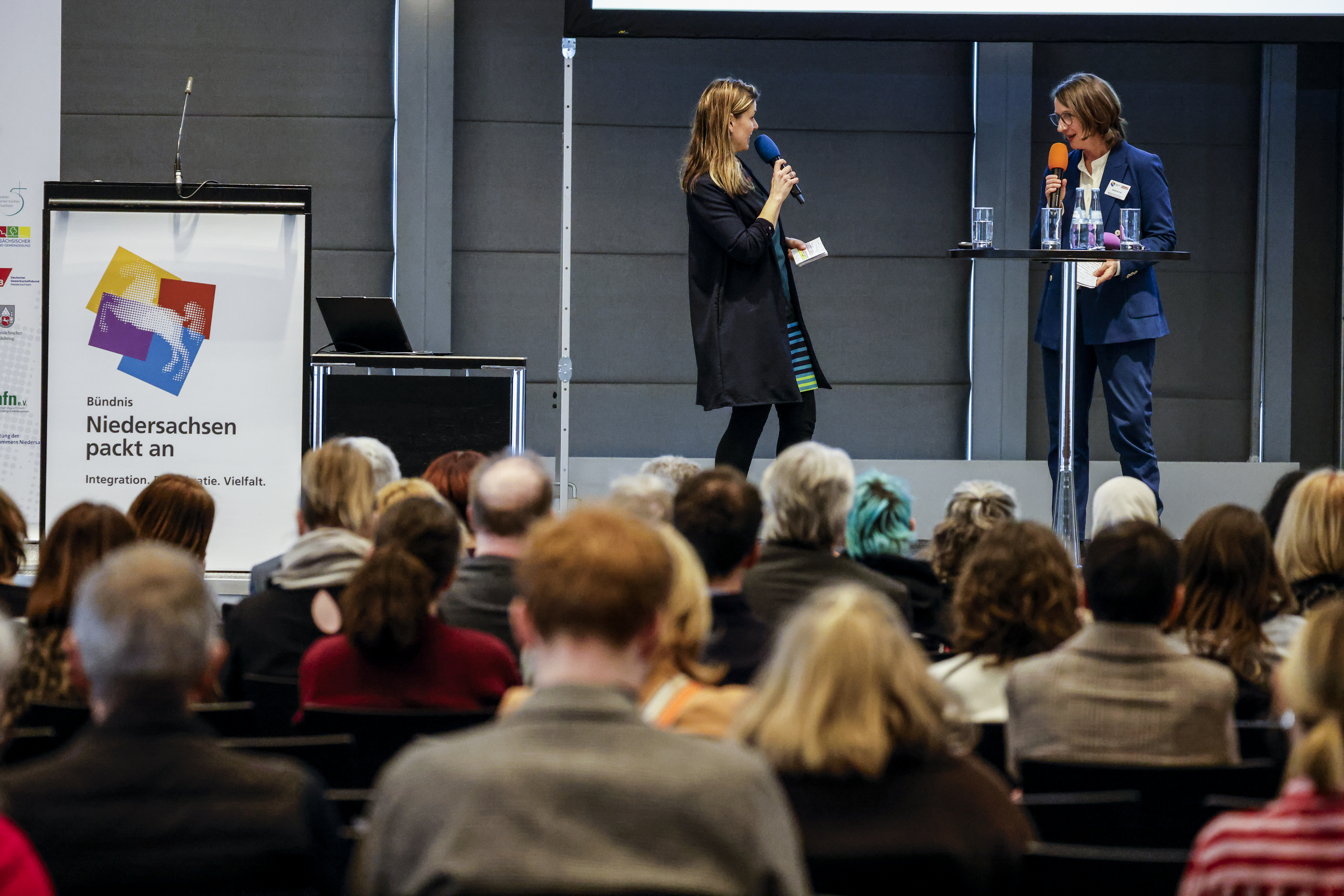 - Als Konferenz, die insbesondere den Blick des „Engagements“ stärken möchte, startete der inhaltliche Teil mit der Perspektive der Ehrenamtlichen am Beispiel von zwei engagierten Frauen: Frau Lydia Balabko (Burgdorf, Ostlandring) und Frau Allaa Alsheikh Moussa (Salzgitter Berliner Straße) zeigten eindrücklich Ihre Wege. Ihr Engagement. Und Ihre Motive. Beeindruckend!
