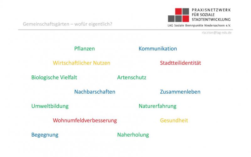 Wie unterschiedlich die Gärten sind, zeigt sich auch an den verschiedenen Schwerpunkten. Seien es Kaninchen, durch die Fürsorge und Verantwortung gelernt werden kann, der Lebensmittelanbau, der aus "benachteiligten" Menschen gefragte Fachleute und Gebende machen kann oder auch die Einbindung von Schulen und Pflegeeinrichtungen, die im Garten gemeinsam ganzheitliche Naturerfahrungen machen können. Allen gemein ist der Garten als "Anlass", als Begegnungs- und Kommunikationsraum, der Ausgangspunkt für Gemeinwesenarbeit sein kann.