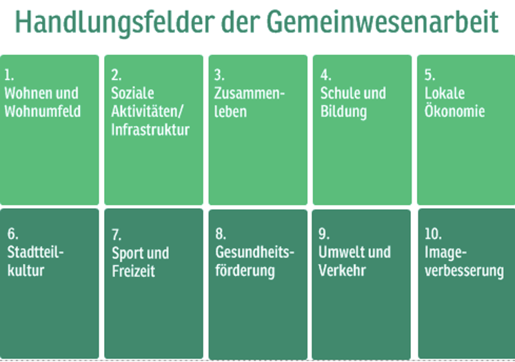 Gesundheitsförderung ist ein zentrales Handlungsfeld integrierter Kommunalentwicklung. Maßnahmen und Projekte, die im Rahmen von Gemeinwesenarbeit in den Quartieren umgesetzt werden und Gesundheitsförderung zum Ziel haben, orientieren sich vor allem daran, Gesundheitsressourcen und -potenziale zu stärken und so die Lebensbedingungen und Gesundheitschancen der Bewohner*innen zu verbessern. Gleichzeitig unterstützen Akteur*innen aus dem Fachgebiet der Gesundheitsförderung Kommunen und Lebenswelten dabei, gesundheitsfördernde Rahmenbedingungen vor Ort zu gestalten.