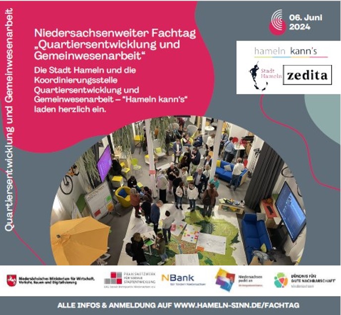 am 06.06.2024 von 10:30 bis 17:30 Uhr bei zedita (Zentrum für digitale Transformation und Neue Arbeit) im Hamelner Bahnhof und mit Vor-Ort-Besuchen in den Quartieren.