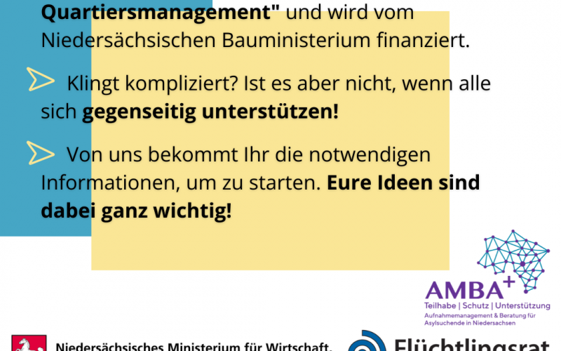 • Gemeinsam mit einem Verein kann das drei Jahre lang gefördert werden. Das Ganze nennt sich “Modellförderung “Gute Nachbarschaft - Gemeinwesenarbeit und Quartiersmanagement" und wird vom Niedersächsischen Bauministerium finanziert.
