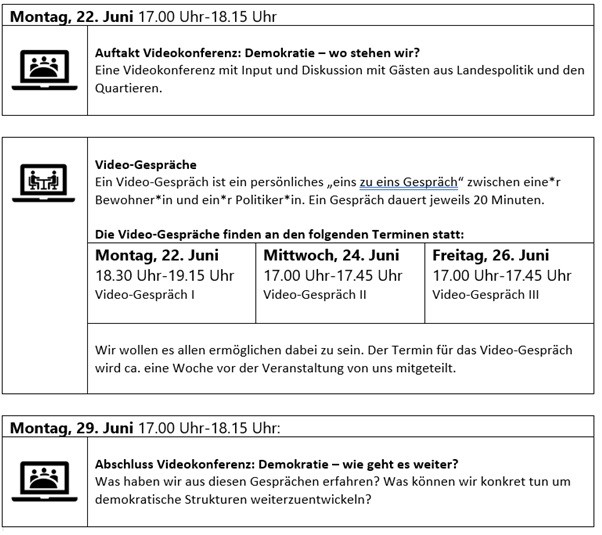 Wir müssen reden, von Mensch zu Mensch. Da das angesichts der Kontakteinschränkungen nicht so einfach ist, probieren wir etwas Neues und bieten eine Art „Dating-Service“ für Bewohner*innen und Politik.
