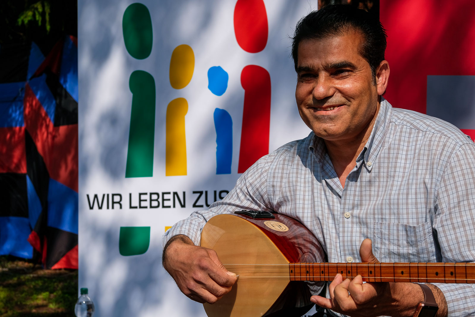 In einer von Markus Kissling vom Praxisnetzwerk für soziale Stadtentwicklung e.V. moderierten Dialogrunde nutzten Bewohner*innen die Gelegenheit, über das Miteinander im Zukunftszentrum aus ihrer persönlichen Sicht zu berichten. Man war sich einig: Die enge Gemeinschaft auf dem Land kann der Integration von zugewanderten Menschen förderlich sein, wenn gute Strukturen und Begegnungsmöglichkeiten wie das Zukunftszentrum vorhanden sind. Musikalisch wurde es, als Gerhard Kreuzer und Ibrahim Arouch internationale Lieder aus der Liederfibel anstimmten, die von der Landesbeauftragten herausgegeben wird und im Zukunftszentrum seit längerem zum Einsatz kommt.