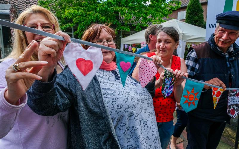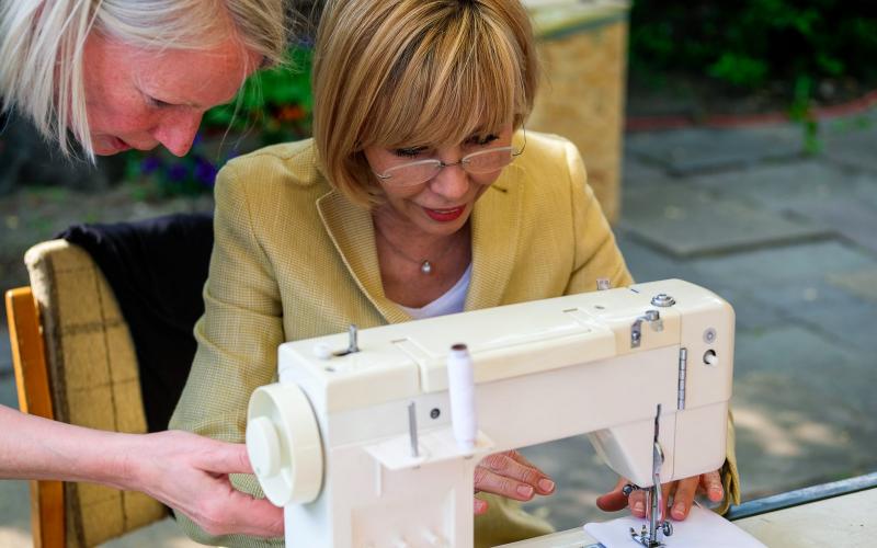 Dann aber standen die vielen Mitmachaktionen im Vordergrund, durch die die Gäste ganz nebenbei miteinander ins Gespräch kamen. Unter anderem wurde gemeinsam eine bunte Wimpelkette genäht, dabei erweckte auch Doris Schröder-Köpf – mit etwas Hilfe – ihre Nähfertigkeiten zu neuem Leben.
