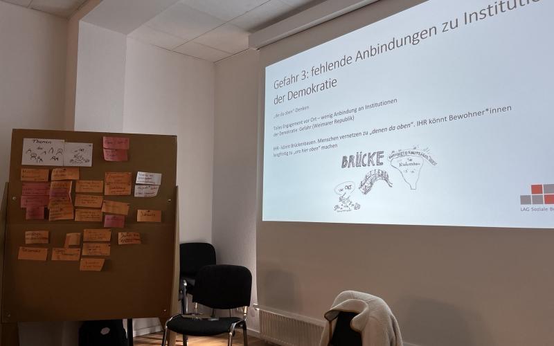 • Nutzen von Aktionen: bspw. die Ausstellungseröffnung „Nachbarschaftsdialoge“ und Fachtag Demokratie beginnt vor Ort: Die Möglichkeit anhand von Plakaten und Nachbarschaftsdialogen die Themen der Menschen im Landtag sichtbar zu machen und die Möglichkeit die Menschen aus den Quartieren mit Landtagsabgeordneten in den Dialog zu bringen. „Ihr seid selbst mit euren Erfahrungen und Ideen im Landtag“