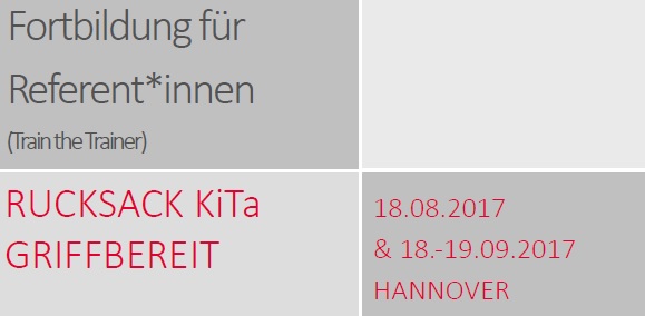 Rucksack KiTa und Griffbereit in Niedersachsen erweitern: Einladung zur Fortbildung "Referent/in für Rucksack KiTa und Griffbereit"
