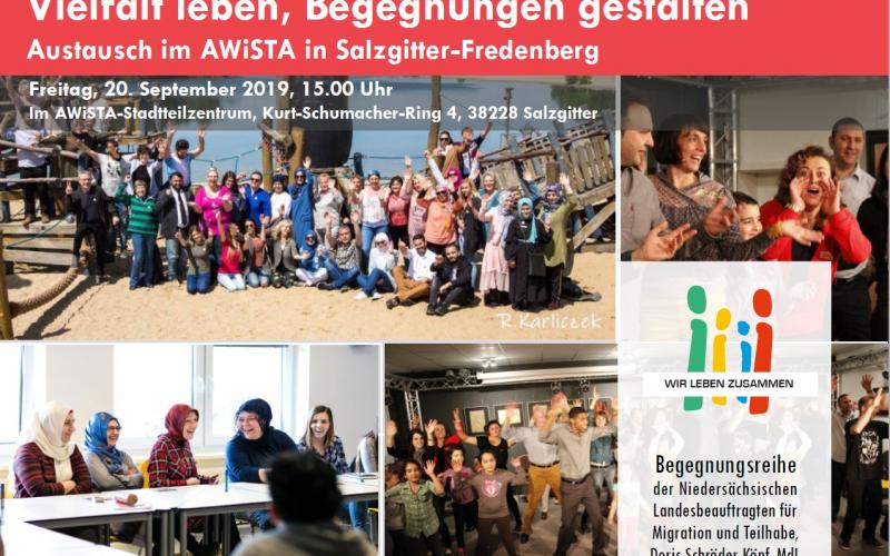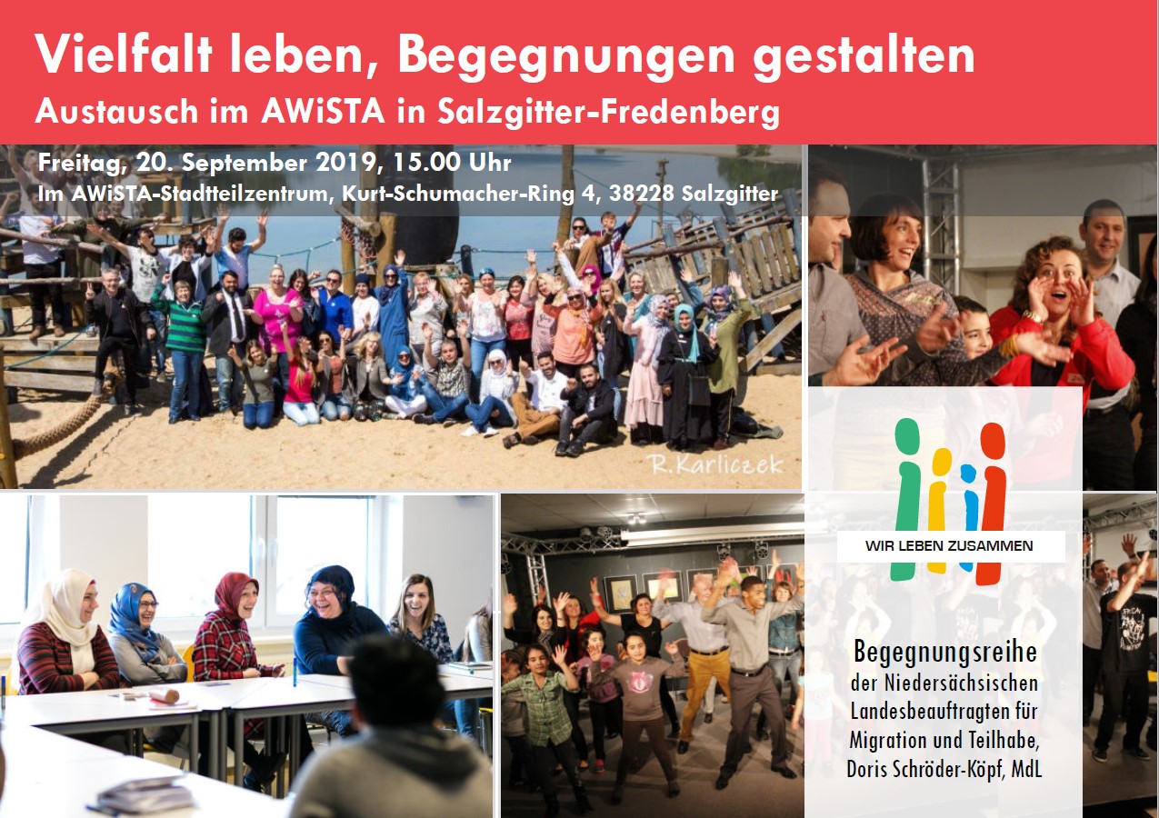 Am Freitag, 20.9.2019, ab 15.00 Uhr, macht die Begegnungsreihe „Wir leben zusammen“ der Niedersächsischen Landesbeauftragten für Migration und Teilhabe gemeinsam mit dem Praxisnetzwerk für soziale Stadtentwicklung bei ihrer vierten Station Halt im Stadtteilzentrum AWiSTA in Salzgitter-Fredenberg. An diesem Nachmittag dürfen sich alle Gäste auf ein lebhaftes Begegnungsfest freuen. Von Bienenstich über Börek bis Baklava – für internationale Köstlichkeiten wird gesorgt sein, ebenso für ein kleines musikalisches und künsterlisches Rahmenprogramm.