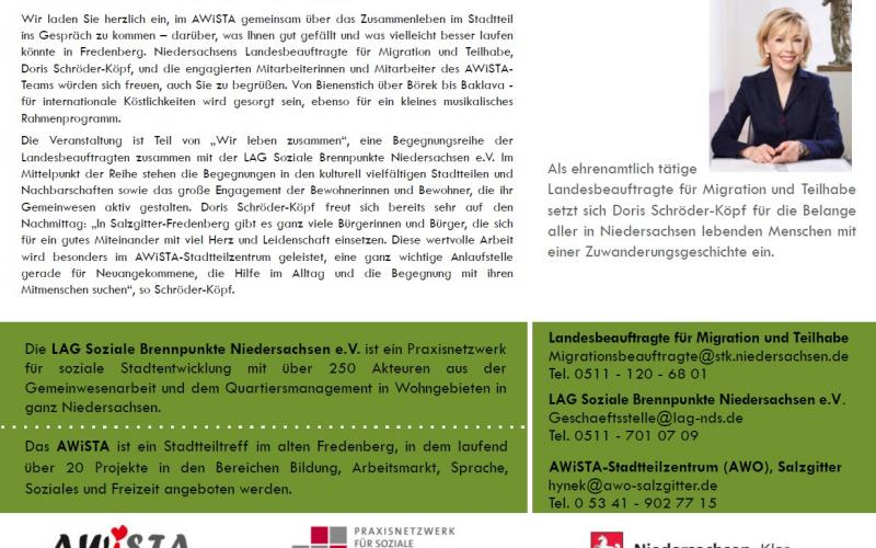 Die Veranstaltung ist Teil von „Wir leben zusammen“, eine Begegnungsreihe der Landesbeauftragten zusammen mit dem Praxisnetzwerk für Soziale Stadtentwicklung. Im Mittelpunkt der Reihe stehen die Begegnungen in den kulturell vielfältigen Stadtteilen und Nachbarschaften sowie das große Engagement der Bewohnerinnen und Bewohner, die ihr Gemeinwesen aktiv gestalten. Doris Schröder-Köpf freut sich bereits sehr auf den Nachmittag: „In Salzgitter-Fredenberg gibt es ganz viele Bürgerinnen und Bürger, die sich für ein gutes Miteinander mit viel Herz und Leidenschaft einsetzen. Diese wertvolle Arbeit wird besonders im AWiSTA-Stadtteilzentrum geleistet, eine ganz wichtige Anlaufstelle gerade für Neuangekommene, die Hilfe im Alltag und die Begegnung mit ihren Mitmenschen suchen“, so Schröder-Köpf.