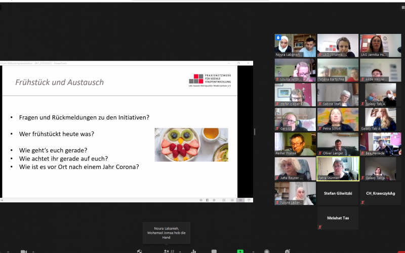 Die zwei Initiativen stellten dabei ihre derzeitigen tollen (Bewohner*innen) Projekte vor und erzählten von ihrem Alltag und ihren Erfahrungen mit einem Jahr Corona. Hameln berichtete zum Beispiel von dem Projekt ‘Wir im Süden - die Südstadt hilft sich selbst’ und der gerade entstandenen Südstadtzeitung. Salzgitter berichtete neben ihren Projekten zudem davon, wie Bewohner*innen in dieser Zeit erreicht werden können und nahm uns mit auf einen spannenden digitalen Rundgang durch den Start.Punkt.Salzgitter.