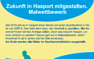 Unter dem Motto „Zukunft in Hasport mitgestalten“ diente Kunst als Medium, um über den Stadtteil ins Gespräch zu kommen. Was braucht Hasport, um noch schöner zu werden? Darum ging es in dem Malwettbewerb, der vom 28.08.-18.09.2019 stattfand. In Kooperation mit der Jugendkunstschule Delmenhorst e.V., die das Projekt künstlerisch begleitete, konnten...