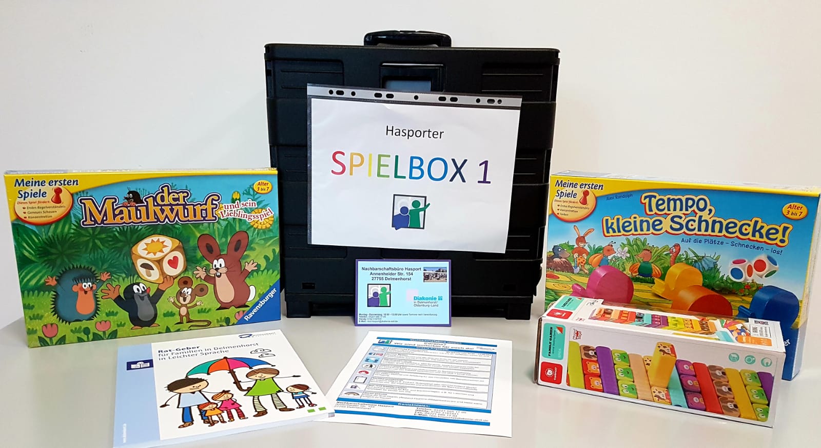 Für ein bisschen Ablenkung im Lockdown sorgen die Hasporter Spieleboxen. Seit Januar 2021 haben Bewohner*innen die Möglichkeit, Spieleboxen im Nachbarschaftsbüro Hasport auszuleihen. Es gibt vier Boxen für unterschiedliche Altersstufen: 3-6 Jahre, 6-9 Jahre, 9-12 Jahre und ab 12 Jahren. Darin enthalten sind 3-5 Gesellschaftsspiele und Informationsmaterialien. Pro Familie kann eine Box für maximal sieben Tage ausgeliehen werden. Auf diese Weise können neue Spiele ausprobiert und kennengelernt werden und sie helfen gegen Langeweile. Des Weiteren beinhalten die Boxen Informationen über das Nachbarschaftsbüro, über aktuelle Coronamaßnahmen und ein Familienratgeber der Stadt Delmenhorst.