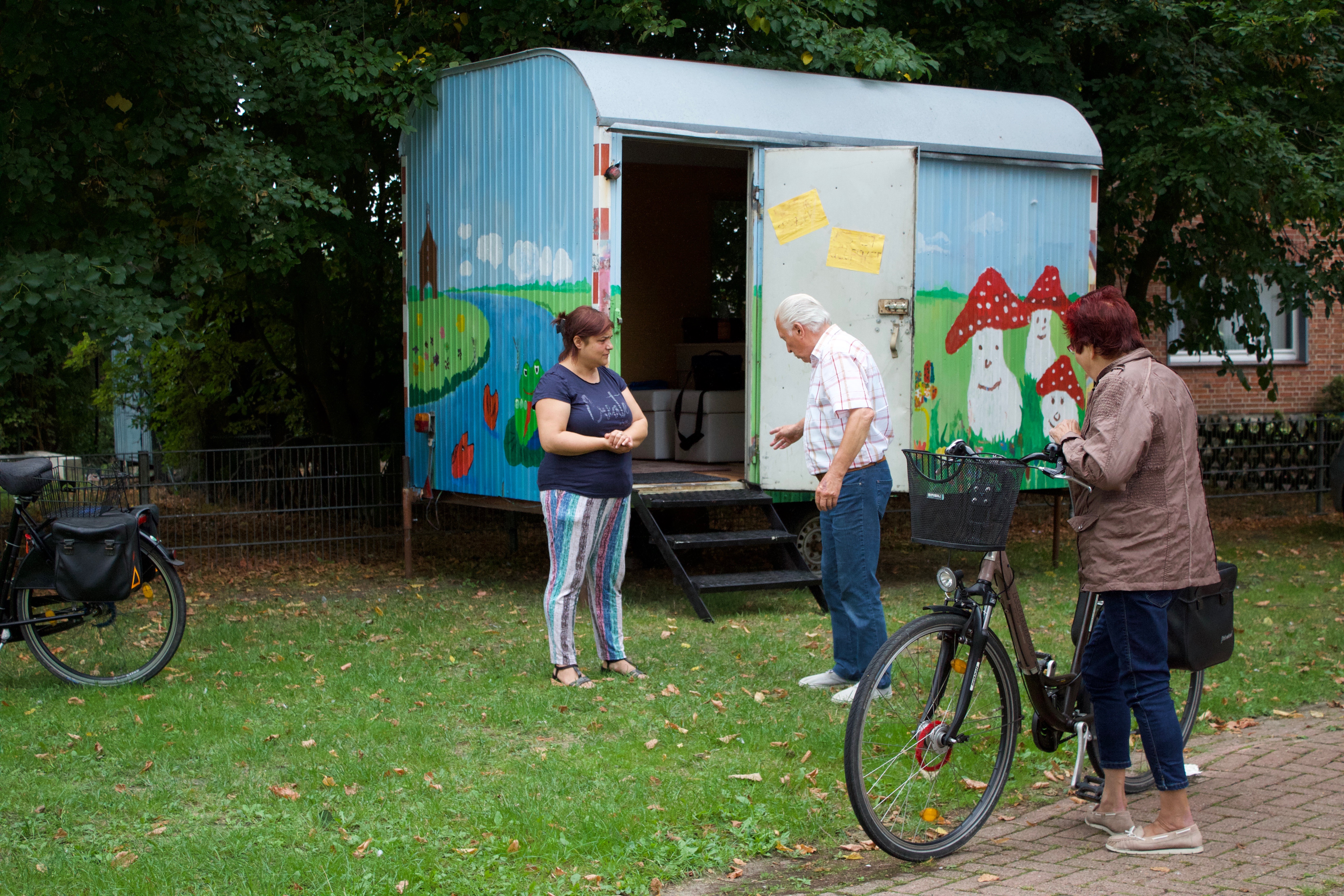 Im Jahr 2019 wurden unter Einbeziehung von Bewohner*innen und Stadtteilakteuren verschiedene begegnungsfördernde Aktionen und Veranstaltungen durchgeführt (z.B.: Neujahrsfeier, Internationaler Frauentag, Stadtteilfest, Aktivitätennachmittage). Wie bereits in 2018 wurden in auch 2019 drei verschiedene Standorte mit dem mobilen Stadtteilbüro aufgesucht. Durch die Aktionen und die öffentliche Präsenz des Bauwagenbüros im Stadtteil hat das Angebot weiter an Bekanntheit gewonnen. Vermehrt suchen Bewohner*innen nun auch selbstständig den Kontakt zur Sozialarbeiterin. Insgesamt hat sich das Projekt zu einer wichtigen (Erst-)Anlaufstelle im Stadtteil etabliert. Die Sozialarbeiterin hilft, Brücken zu bauen und Menschen in „Bewegung“ zu setzen, z.B. indem sie ermutigt werden, bestehende Unterstützungsstrukturen und Partizipationsmöglichkeiten in Anspruch zu nehmen. In vielen Fällen hat dies zu einer stärkeren gesellschaftlichen Teilhabe von Bewohner*innen (insb. mit Migrationshintergrund) geführt. Im Mai 2019 wurde zudem ein Nachbarschaftsbüro in einer leerstehenden Wohnung in der Tilsiter Straße eingerichtet, welches im kommenden Projektjahr zu einem Begegnungsort weiterentwickelt werden soll (erste Projekte wie ein offenes Spielangebot in Kooperation mit der offenen Kinder- und Jugendarbeit in Quakenbrück wurden hier bereits initiiert).