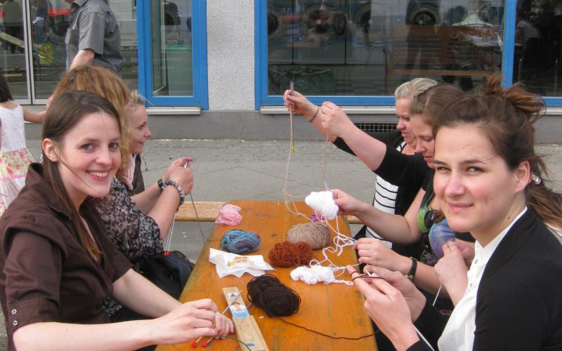 Passend zur Kaffeezeit am Nachmittag wurden Waffeln als kleines kulinarisches Angebot gebacken. Sie fanden nicht nur bei den Senioren des nahegelegenen Godehardistifts, die länger am Stand verweilten, sondern auch bei Laufkundschaft viel Anklang und waren am späteren Nachmittag ausverkauft. Als gemeinsame Aktivität von Jung und Alt war neben Stricken und Gesellschaftsspielen das Bemalen oder Bedrucken von Einkaufsbeuteln geplant.
