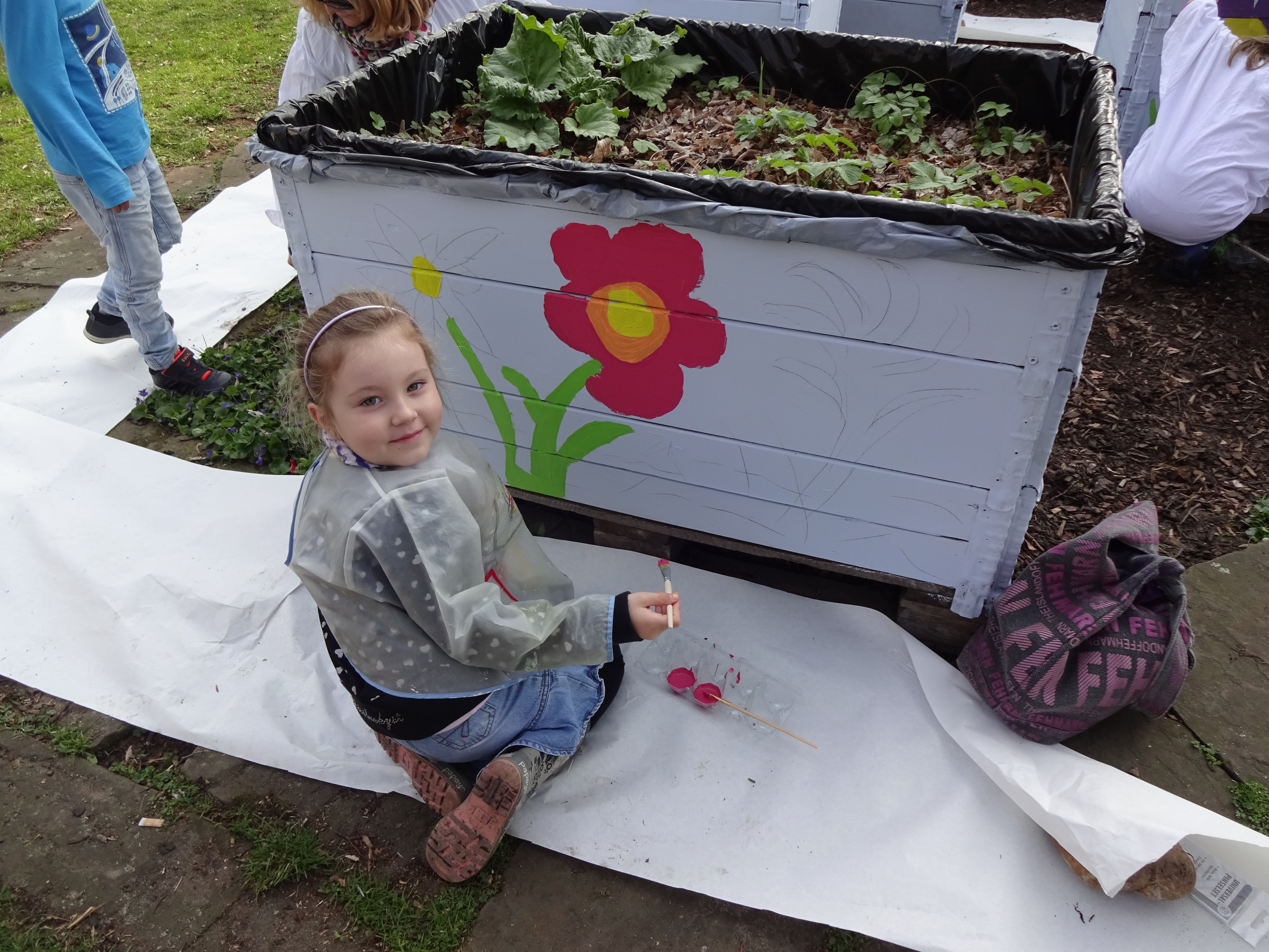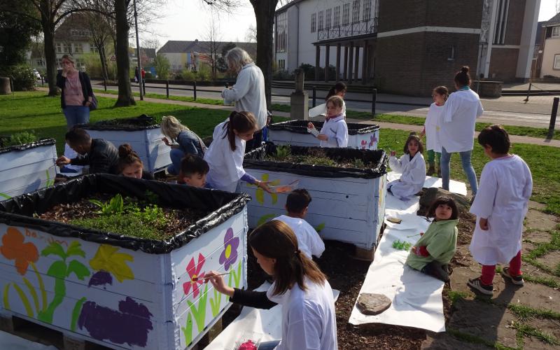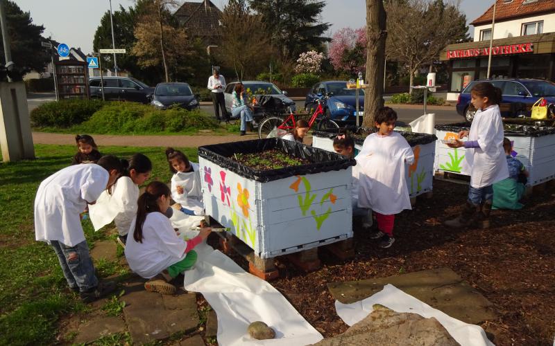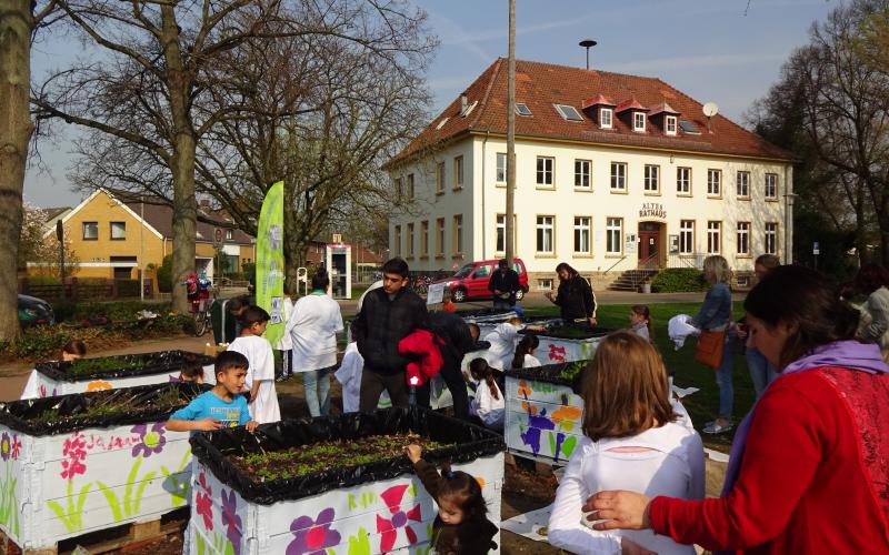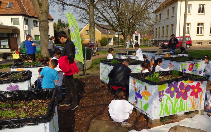 Der Verein "Letter-fit: Miteinander-Füreinander" e.V. hat mit Kindern der Kita Hirtenweg und Flüchtlingskindern die Kisten des Palettengartens vor dem Alten Rathaus Letter bemalt. Auch einige der Kinderaus dem 2 km entfernten sozialen Brennpunkt waren aufgrund persönlicher Ansprache gekommen.